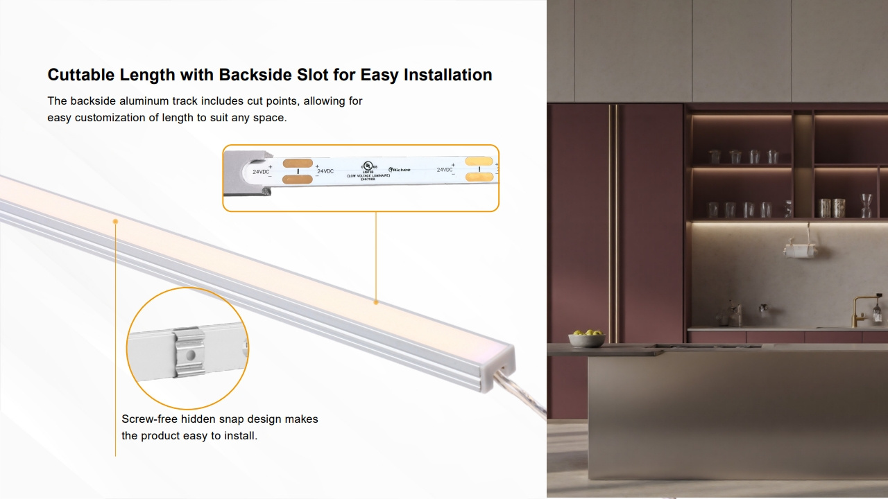 The 6464F Slim Light Fixture is as rigid LED bar that features a built-in aluminum channel. It is a seamless, spotless light that can be cut to size every 2.5 inches. Connect up to 15 meters for continuous indoor or outdoor runs. It is a complete two-in-one solution offering the customization of LED strips with the polished performance of an integrated aluminum channel.